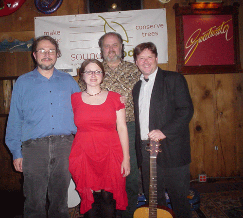 DG, Jolie Holland, Michael Stadler, and host Robert Garner at Sweetwater following the Soundwood benefit 4/29/03