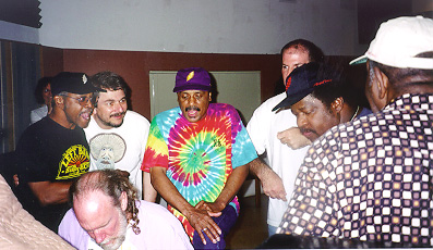 Working on "One More Saturday Night". Left to right: Joe Russell, Andrew Chaikin, Vince Welnick, Jerry Lawson, Jayotis Washington, Jimmy Hayes, Raymond Sanders.