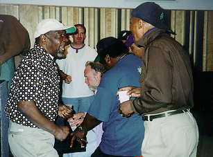 piano. Left to right: Jayotis Washington, David Gans, Jimmy Hayes,
