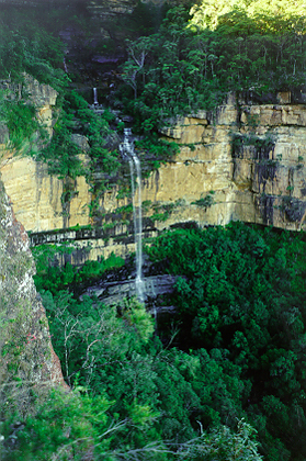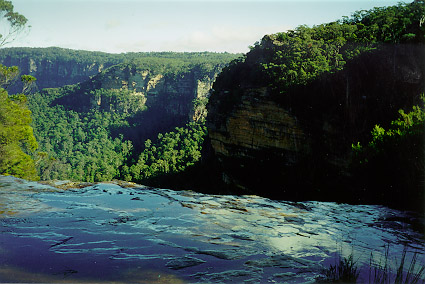 The track doubled back and took us back across Wentworth Falls a couple hundred feet below where we crossed the first time, under a broad rock rim. At this point there was no solid stream of water coming down at all: the flow was completely atomized coming over the rim, blown away from the receding rock face by the wind; collected itself into several small streams all the way down the side of a beautiful broad sandstone wall, landed on a ledge, came down in a couple of major streams onto another ledge, and collected in pools at the level where we were standing. As we continued along the track another few hundred yards, we were able to see that the next section of Wentworth Falls was a sheer drop of a couple hundred feet, below which the rainforest obscured the flow from our vision.