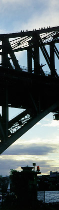 Dawes Point Park, under the Sydney Harbor Bridge, seems to be a very popular spot for wedding photographs. We encountered six or seven wedding parties, all in full regalia, standing around in the wind getting their pictures taken. One little girl of about five (I heard her auntie call her Felicity), wearing a huge chiffon dress and a fleecy white jacket, was literally blown over by the wind! She wasn't much interested in standing still, anyway: she and a tuxedoed boy of about the same age spent the entire time charging about on the huge lawn, eluding the various parents and aunties who tried to round them up. We heard many languages, saw many very expensive hairdos standing up to the stiff winds. Two hardy young boys pretended to try to push over a palm tree that was thicker than both their grandparents put together. There were families holding flutes of champagne while the photographers and videographers struggled with their setups; frantic assistants trying to keep the kids in line and the brides happy. Troops of groomsmen stood around bullshitting in their expensive suits. There was a mid-'50s Cadillac convertible parked in the street by the big lawn, with a happy-looking middle-aged couple in the back seat and a bored-looking driver (rught-hand drive) fondling a mother-of-pearl steering wheel. Big fuckin' fins. Huge.